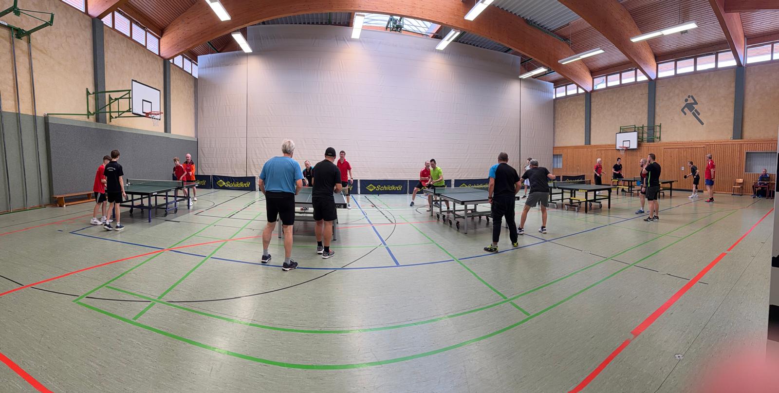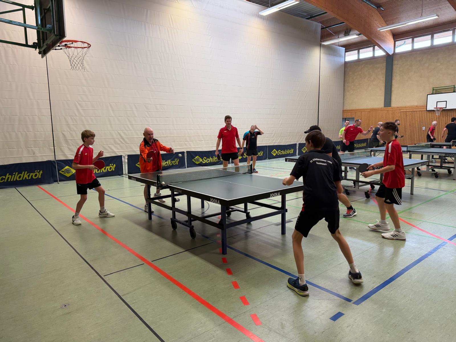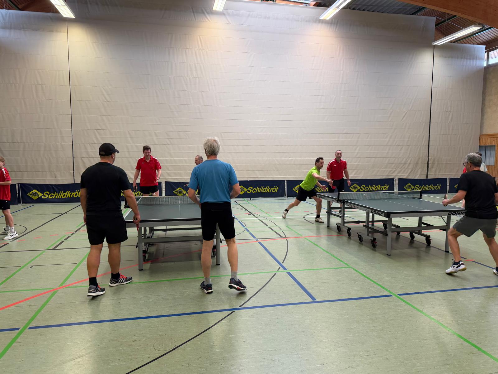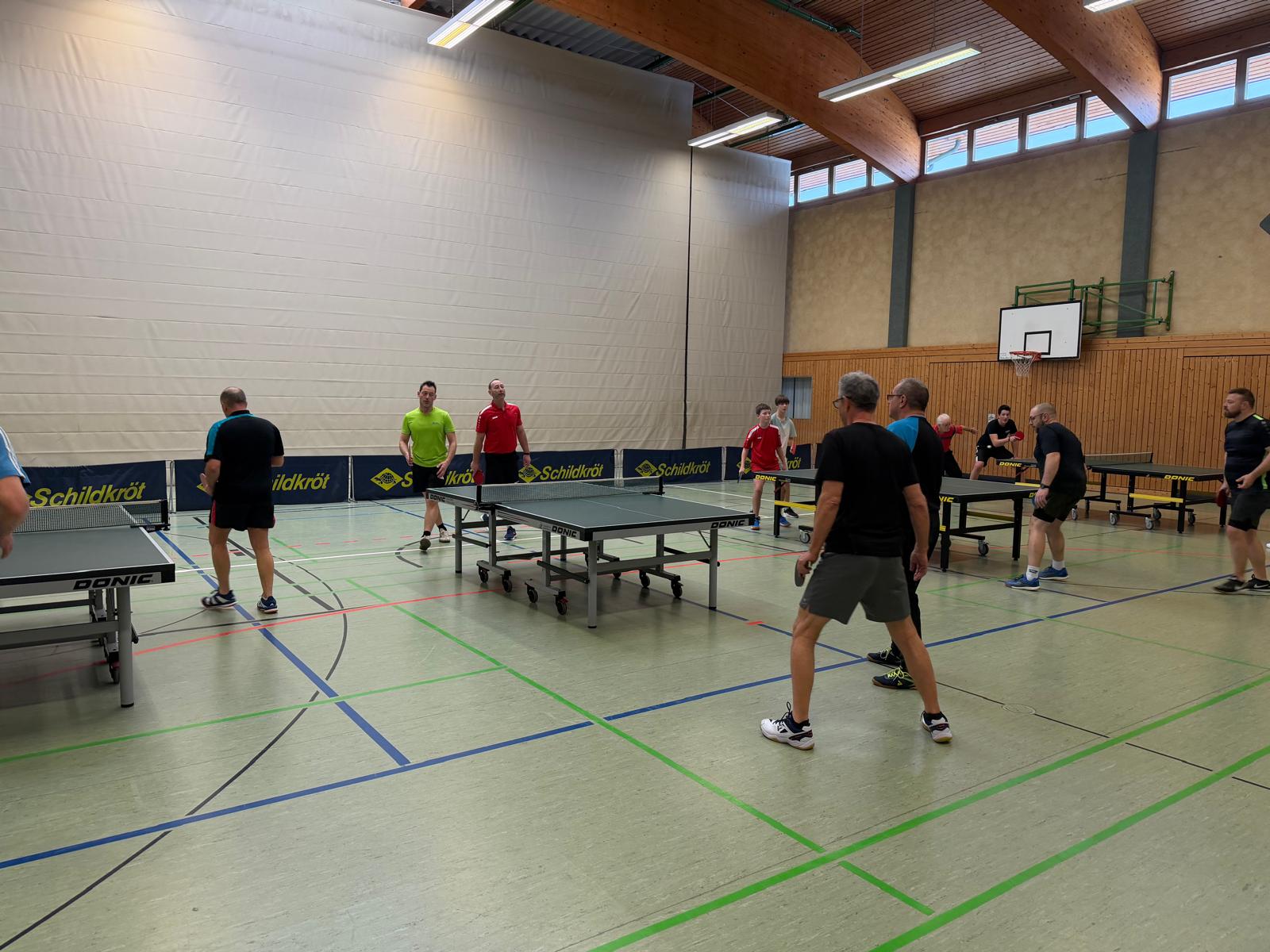 An unserem TT-Doppelturnier beteiligten sich insgesamt 20 Sportfreunde. Gespielt wurde nach einem Bonussystem bei dem Nichtaktive und Nachwuchssportler auch entsprechende Chancen hatten. Das Interessante dabei ist, dass nach jeder Partie neue Doppelpaarungen ausgelost wurden. Nach insgesamt 10 Vorrundenspielen mit 3 Sätzen bis 15 wurden dann nach dem Ranking die einzelnen Platzierungsspiele durchgeführt.